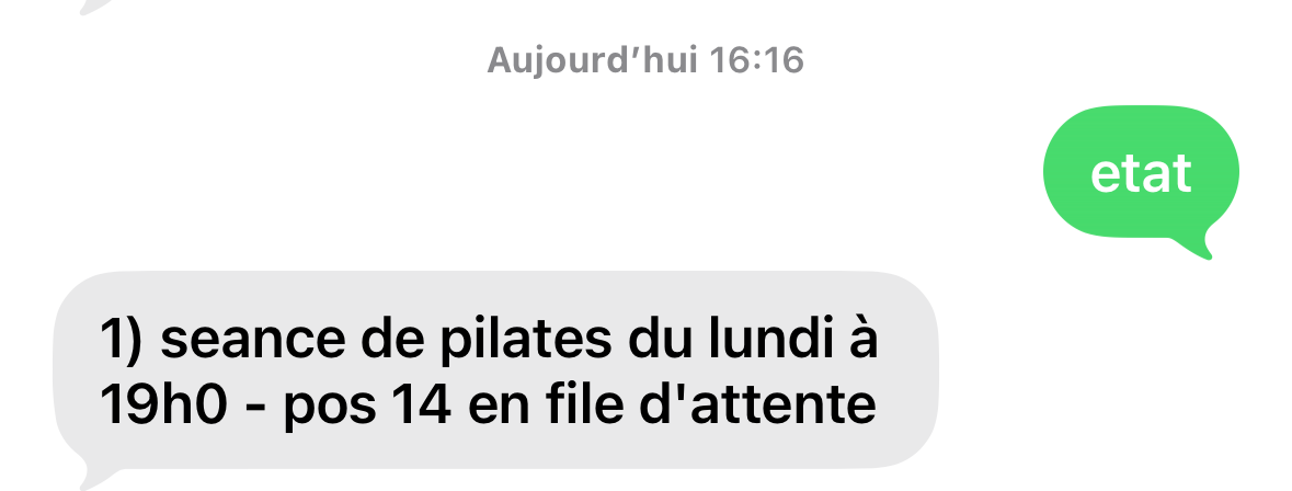Lorsqu'une personne ayant réservé pour une séance se désiste, la première en file d'attente reçoit un SMS lui indiquant que sa réservation redevient effective.