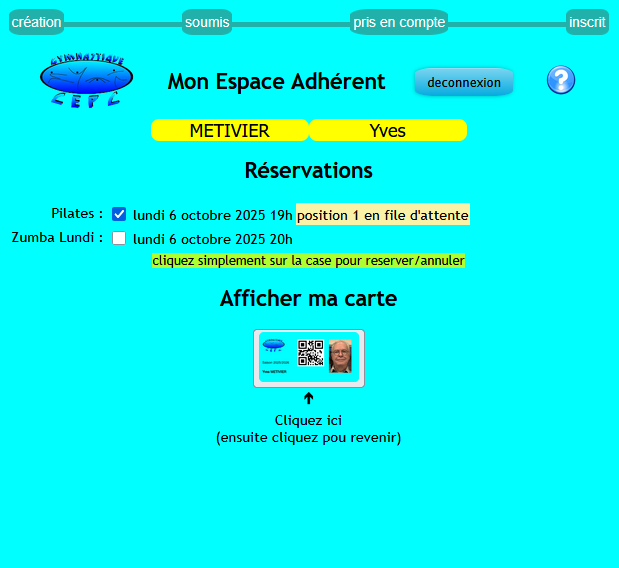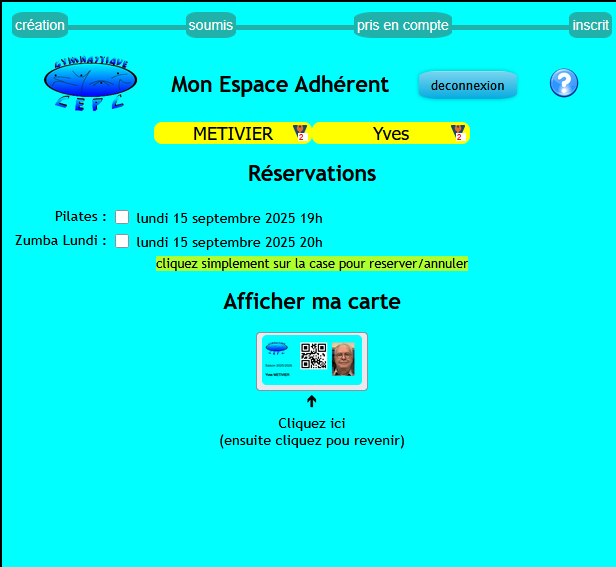 Les réservations pour les séances du lundi peuvent se faire, pour ceux qui sont inscrits (ayant reçu leur carte), via l'espace adhérent (voir ci-dessous).